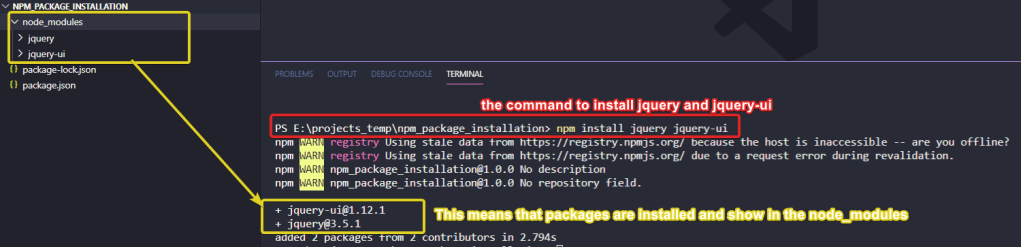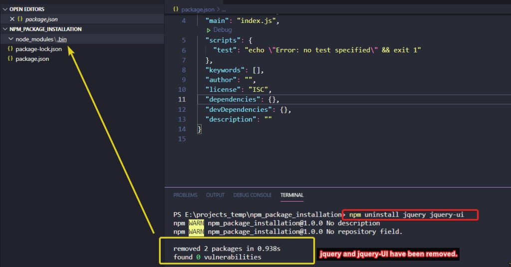 Great, you have installed those two popular packages. How about removing them? It is easy, and you can then type npm uninstall jquery jquery-ui in the command line.